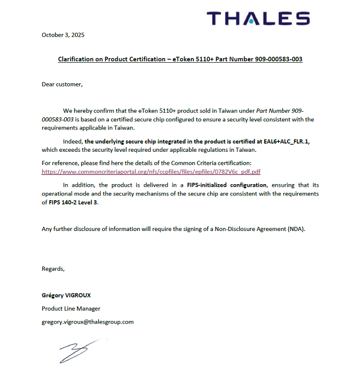 特此確認,在台灣銷售的eToken 5110+ (料號: 909-000583-003),基於經過認證的安全晶片,該配置可確保其安全等級符合台灣相關法規之要求。
